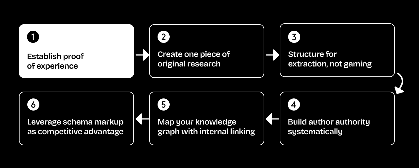 This requires actual expertise you can demonstrate with original data, consistent execution across comprehensive content, technical rigor in how you structure and mark up content, and author credibility with verifiable track records. It's harder than traditional SEO tactics, but it's also more defensible. Anyone can build backlinks. Not everyone can publish original research or earn citations from AI engines and respected publications.